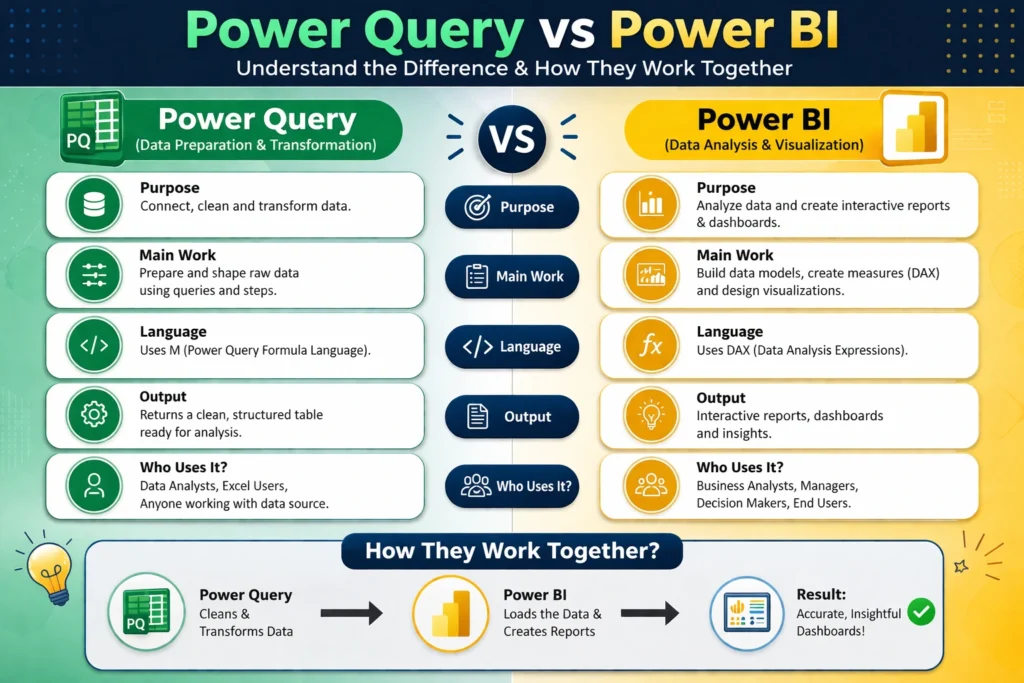 Power Query is already built inside Power BI, so it’s not something you choose instead of it. A better way to think about it is this: Power Query handles the messy work before analysis, and Power BI handles everything that comes after.